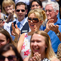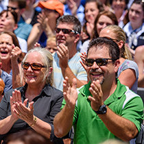 Die versammelte Menschenmenge feierte die Eröffnung des West-Coast-Gebäudes (WB) und des Flag-Crew-Verwaltungsgebäudes (zuvor als das Lee-Arnold-Gebäude bekannt).