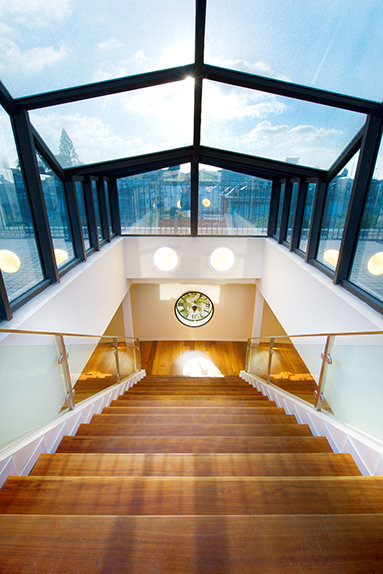 Das Scientology Zentrum hat ferner eine Dachterrasse und ein Café. Eingerahmt von einem ovalen Säulengang, bietet es einen weiten Blick auf das historische Zentrum von Jaffa.